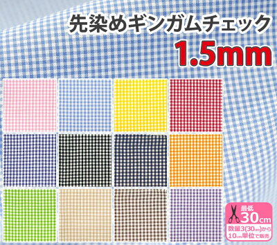 先染めギンガムチェック1.5mm桃色 水色 黄色 赤 青 黒 紺 緑 茶 紫【生地・布】53000-1